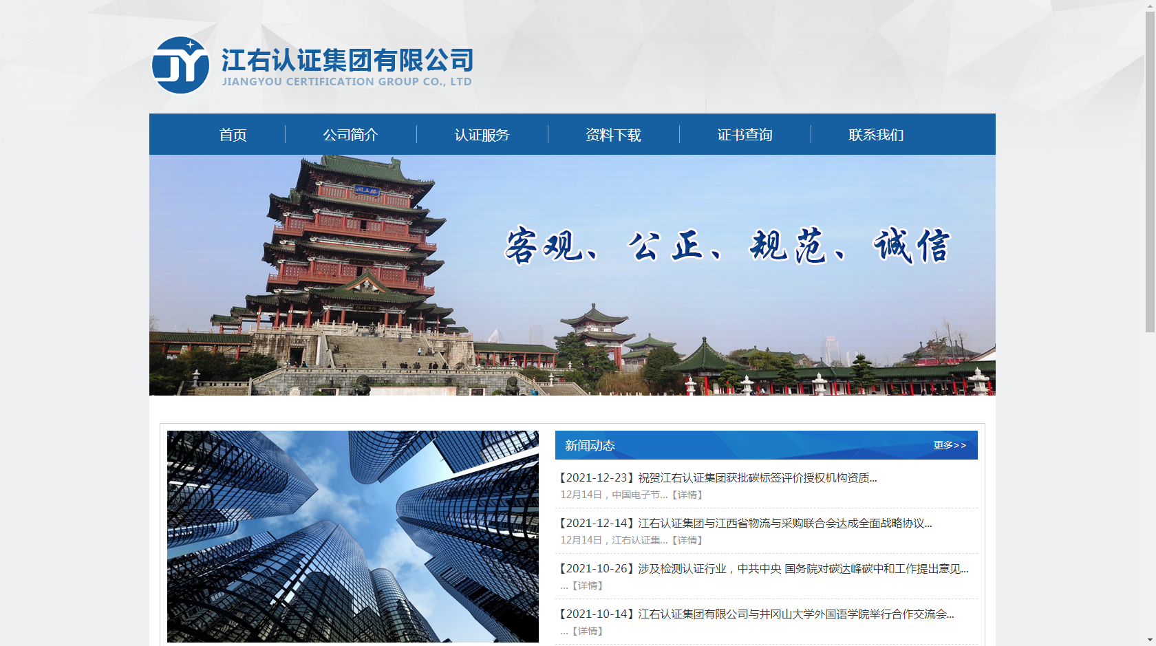 江右认证集团有限公司于2021年03月09日在国家市场监管总局注册成立,是经国家认证认可监督管理委员会(CNCA)批准并颁发权威证书的具有独立公正地位的第三方认证机构,机构批准号:CNCA-R-2021-874。公司业务范围涵盖管理体系认证、服务认证、产品认证和产品质量检测等方面。公司设置部门包括:审核管理部、综合财务部、认证决定部、产品研发部、业务推广部等。公司建立有高速运行的内部局域网,使用统一的管理信息系统,以实现认证申请受理、审核计划安排、人力资源管理、信息发布、证书制作发放等全流程电子化管理。
